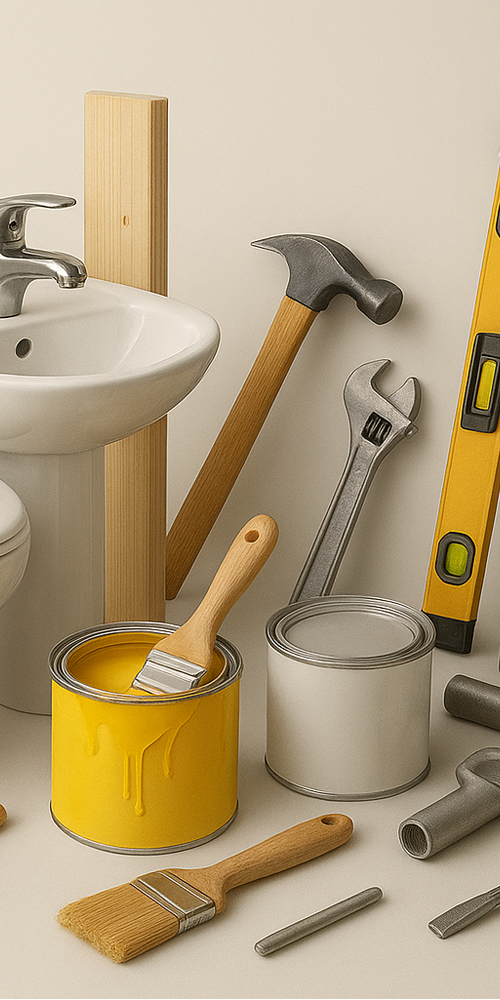 Hardware and paint supplies including tools, paints, brushes, and construction accessories